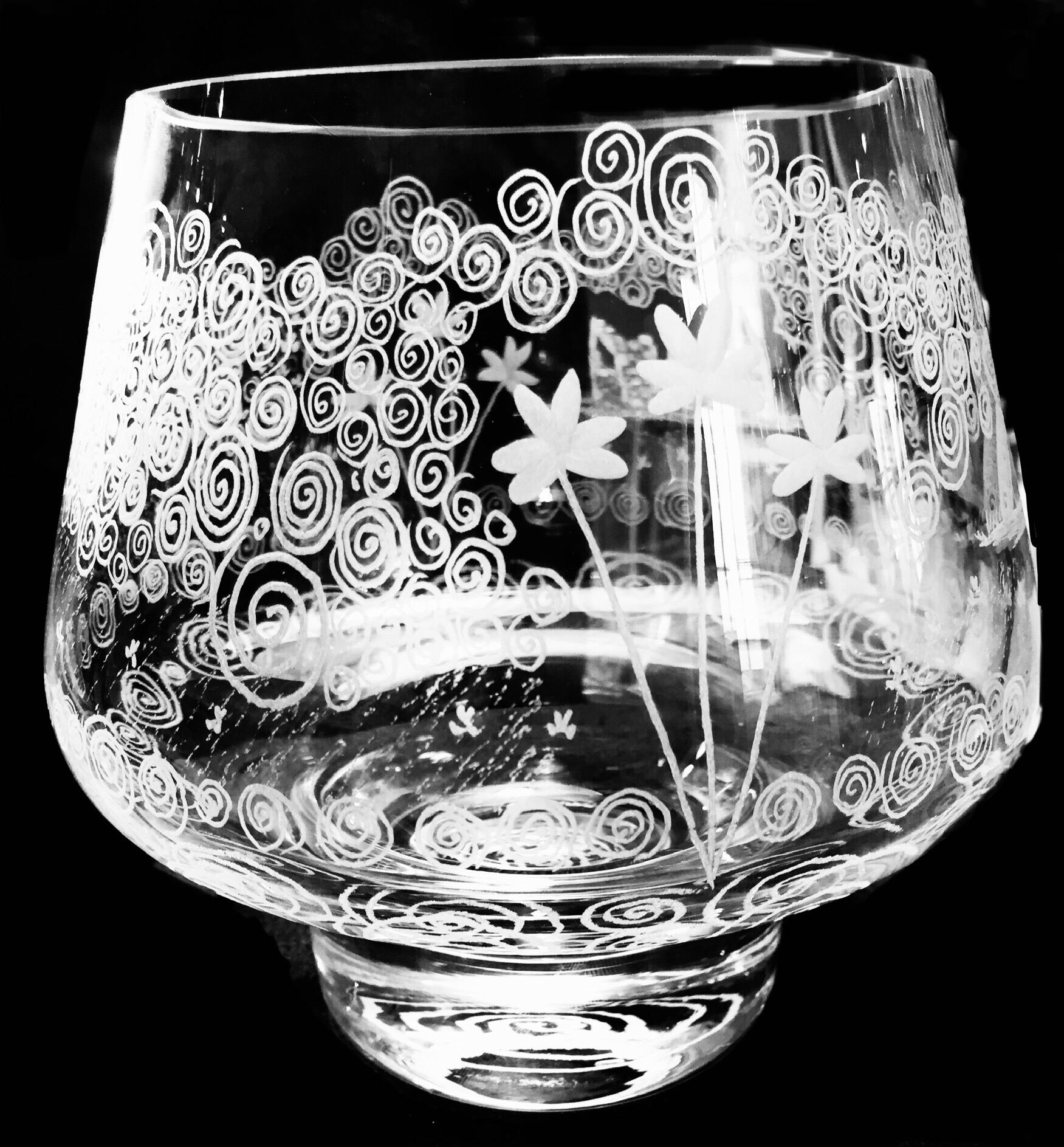 8" Crystal footed bowl with Celtic Dream motif. Decorated all around with the iconic symbols of Ireland. The Irish harp, shamrock, Celtic knot and tiny shamrocks and Celtic designs. Unique to Sean Egan Art Glass.